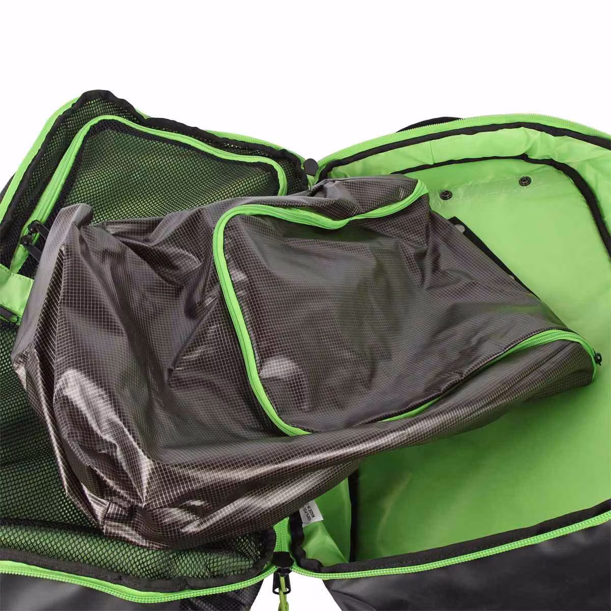 - Mångsidiga organisationsmöjligheter: Förformad hjälmfack/2 ytterfack/2 stora, delade innerfack / låsbar, avtagbar, vattentät väska i huvudfacket (t.ex. för våt våtdräkt eller Wetsuit)/sidoficka (t.ex. för drickflaska) / sidoficka med klämma (t.ex. för nycklar)/fleecefilt fack (t.ex. för solglasögon, värdesaker.